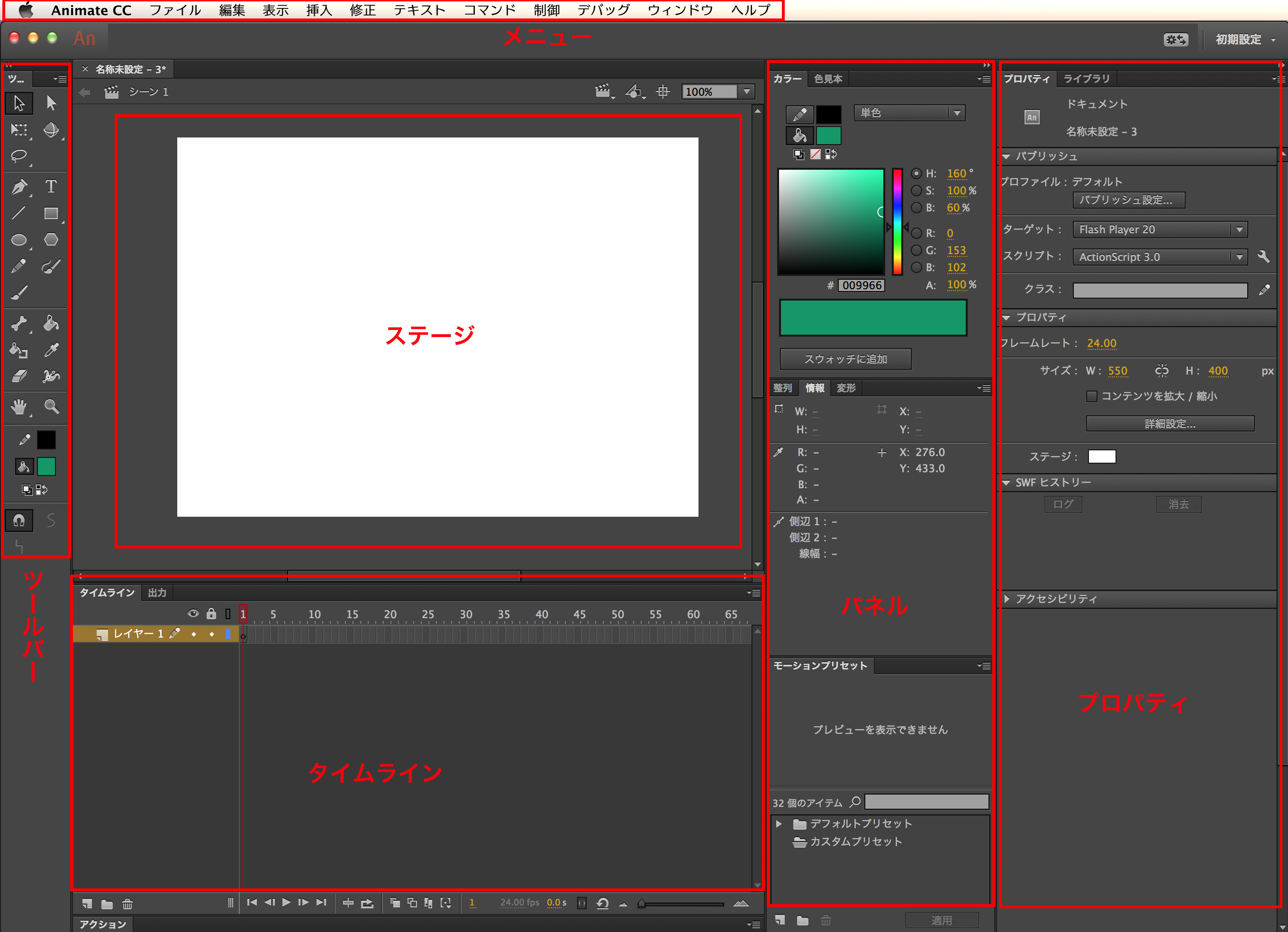 - 時間軸、ここでアニメーションの時間を設定したり、レイヤーを増やす事ができます。