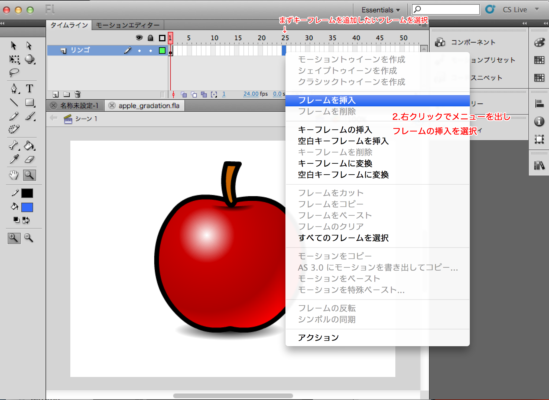 初期設定では24フレームで1秒になっています。(ステージのプロパティから変更できます。)